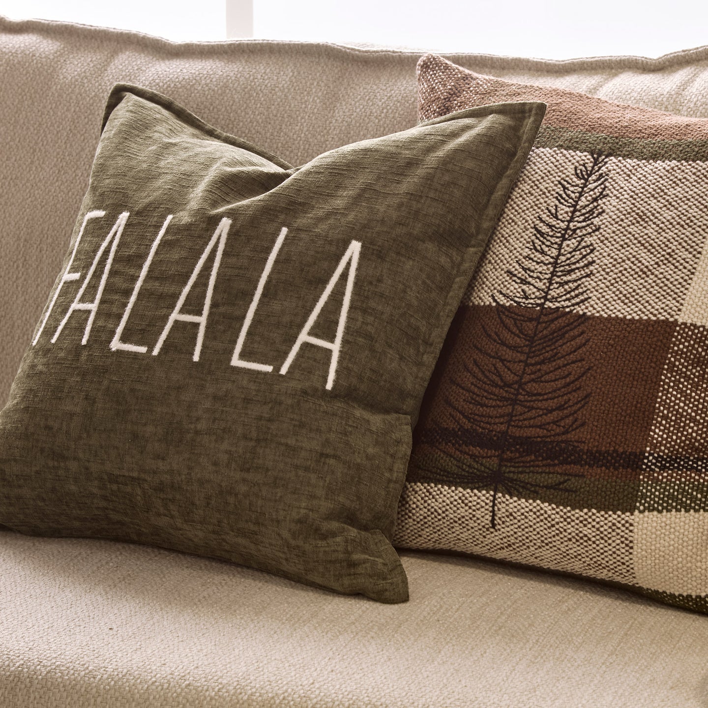 Des coussins festifs douillets dans des tons neutres chauds et des tartans, avec des graphismes festifs et des messages joyeux.